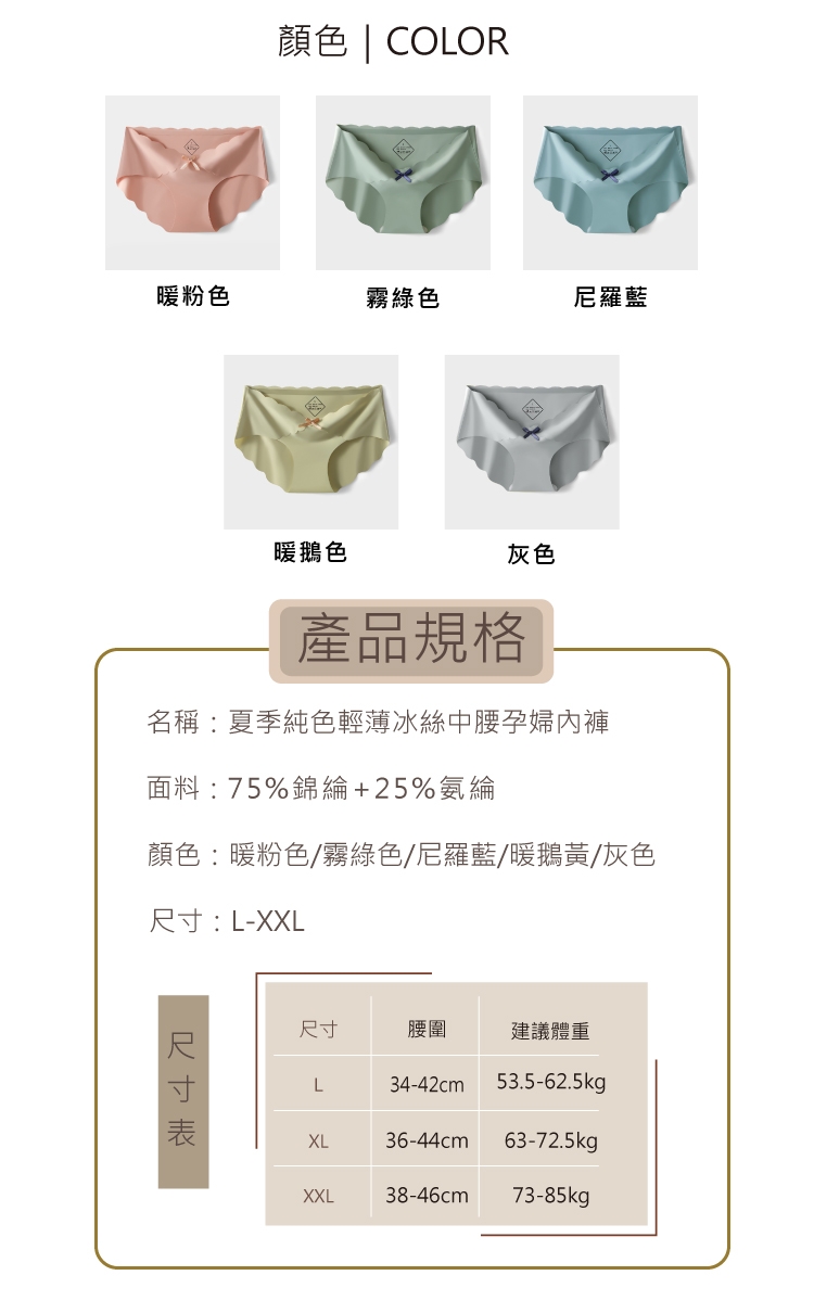 尺碼:L、XL、2XL 顏色:暖粉色/霧綠色/尼羅藍/暖鵝黃/灰色 材質:75%錦綸+25%氨綸 底襠:純棉