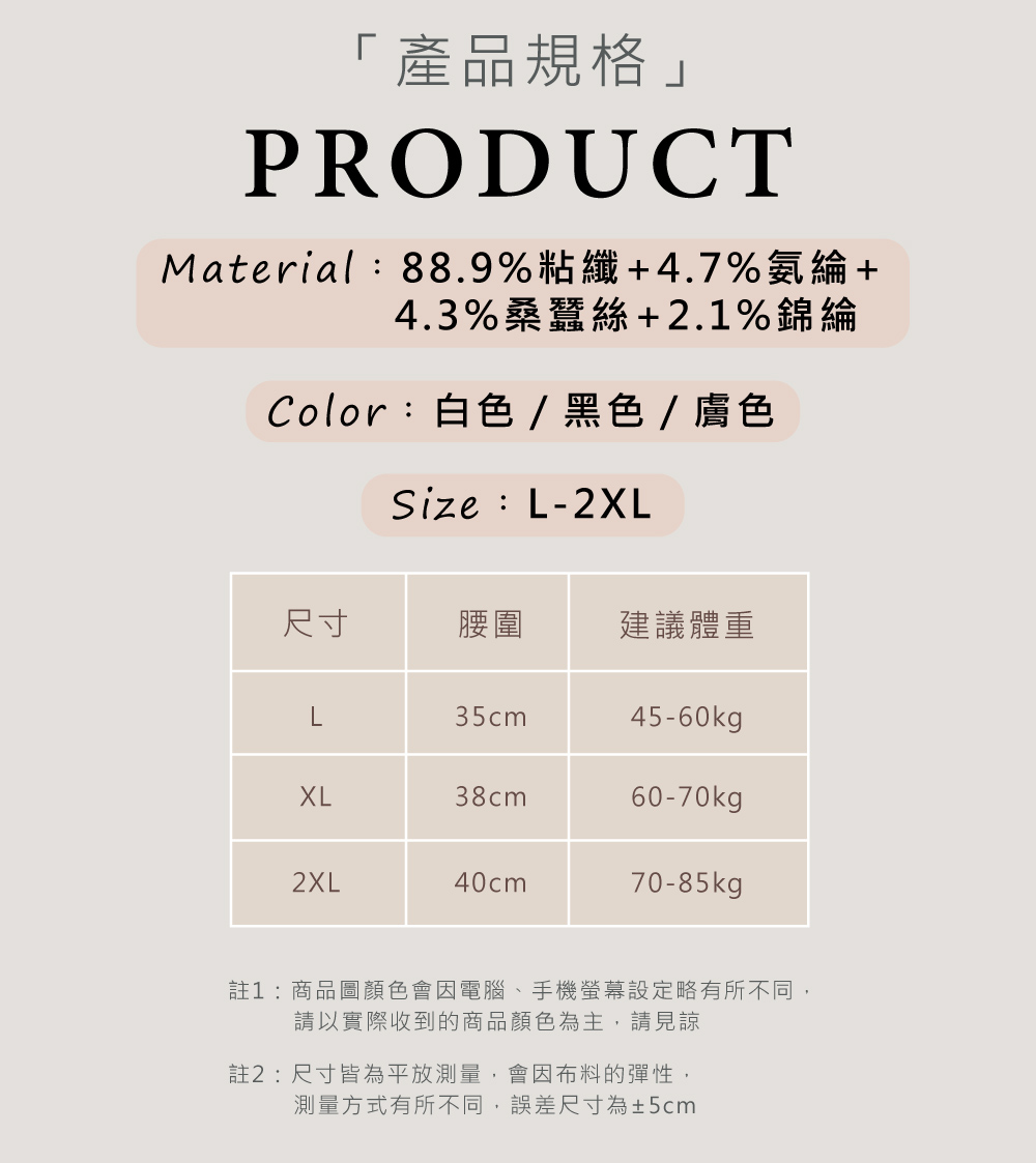 尺碼:L、XL、2XL 材質:88.9%粘纖+4.7%氨綸+4.3%桑蠶絲+2.1%錦綸