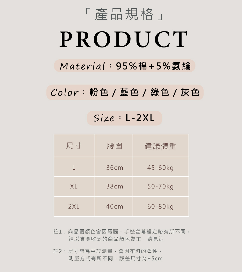 尺碼:L、XL、2XL 材質:95%棉+5%氨綸 底襠:純棉