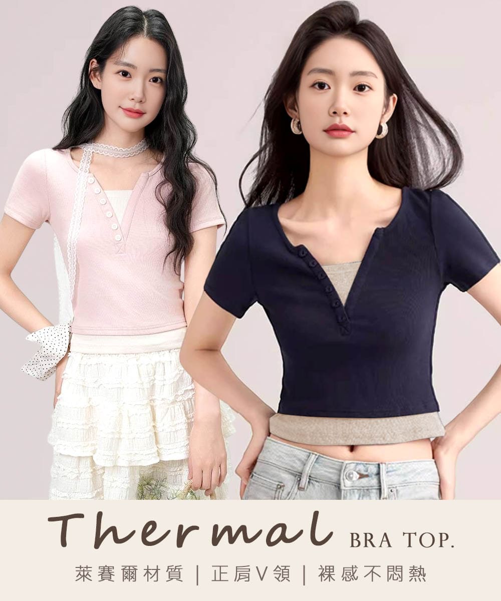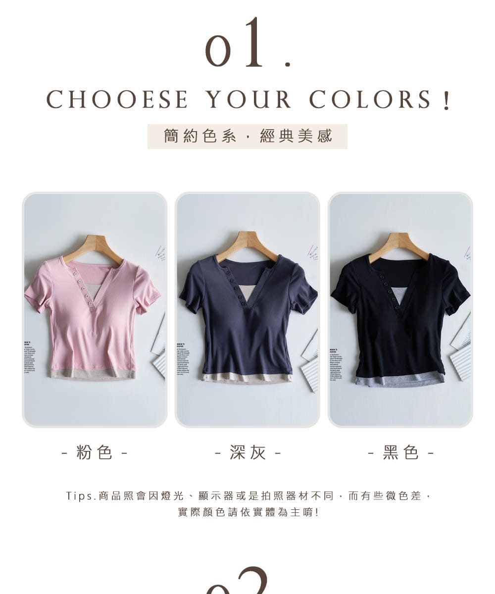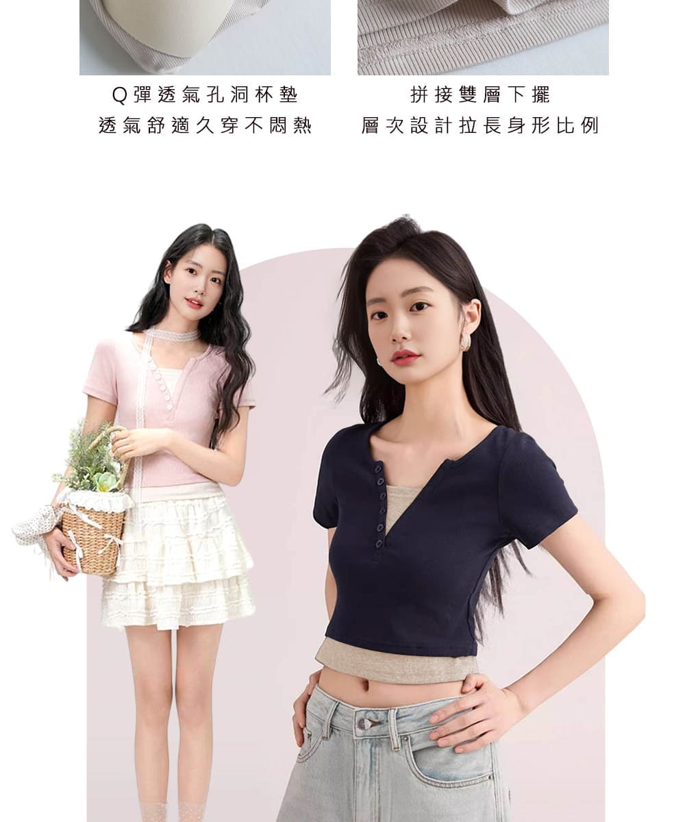 【Kosmiya】2件組 帶罩杯 拼接V領正肩短袖襯墊上衣/小可愛/BRATOP/無鋼圈內衣/女內衣(3色可選/M-XL)