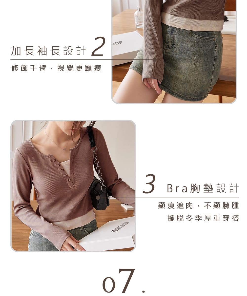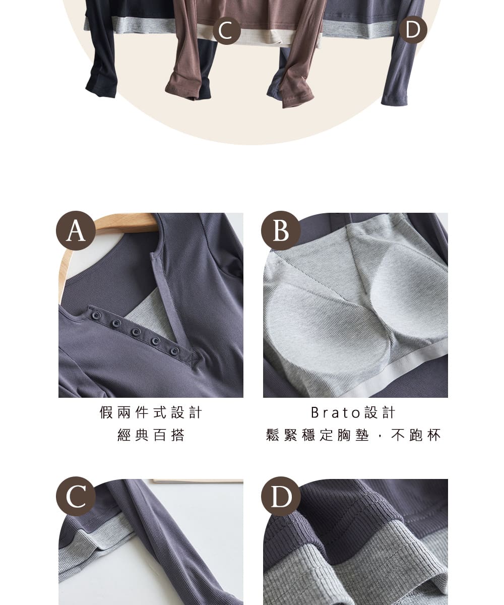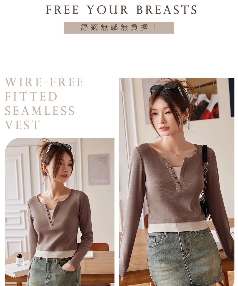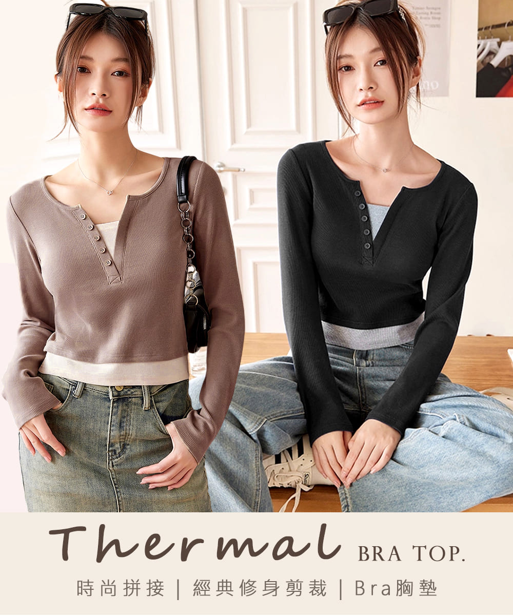 【Kosmiya】2件 帶胸墊 拼接V領長袖胸墊上衣/BRATOP/無鋼圈內衣/女內衣/保暖上衣(3色可選/M-XL)
