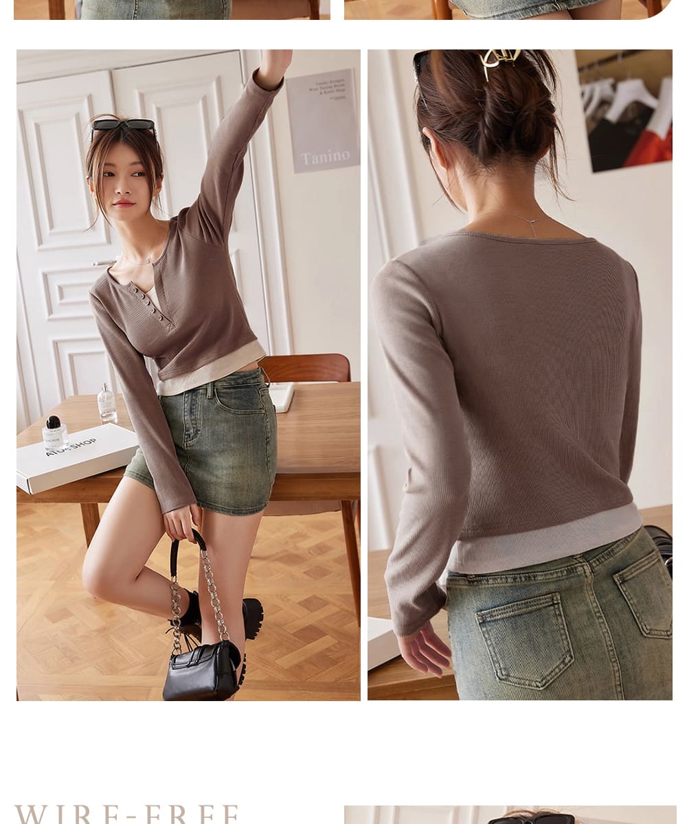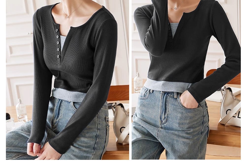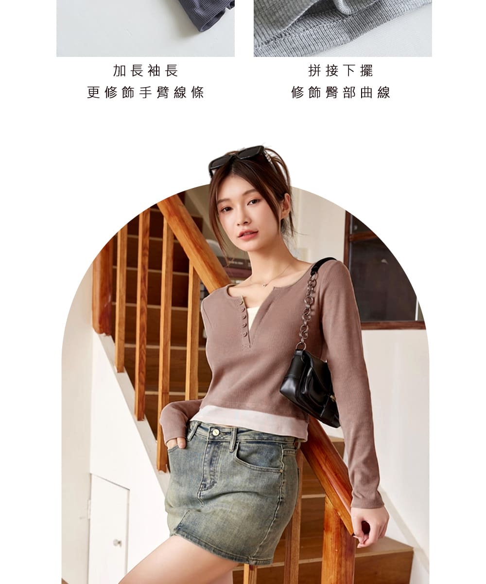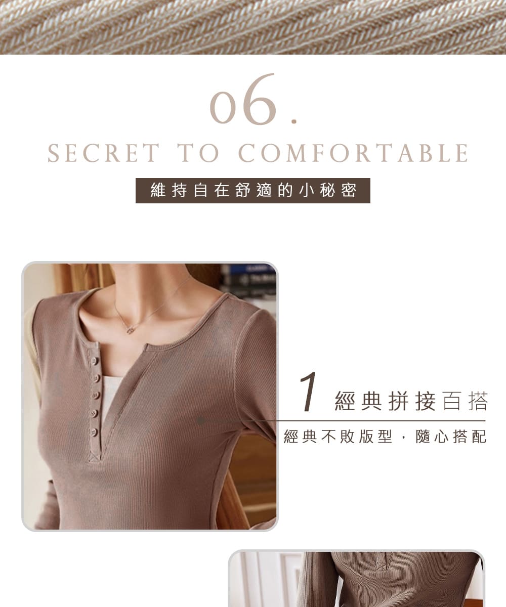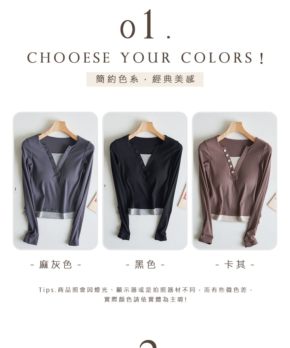 【Kosmiya】2件 帶胸墊 拼接V領長袖胸墊上衣/BRATOP/無鋼圈內衣/女內衣/保暖上衣(3色可選/M-XL)
