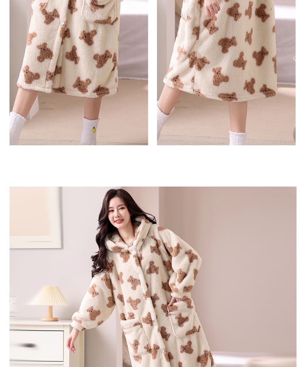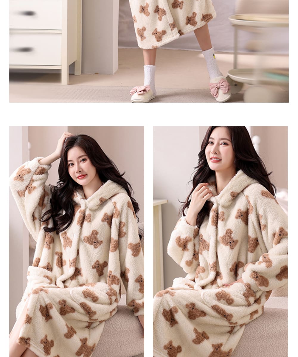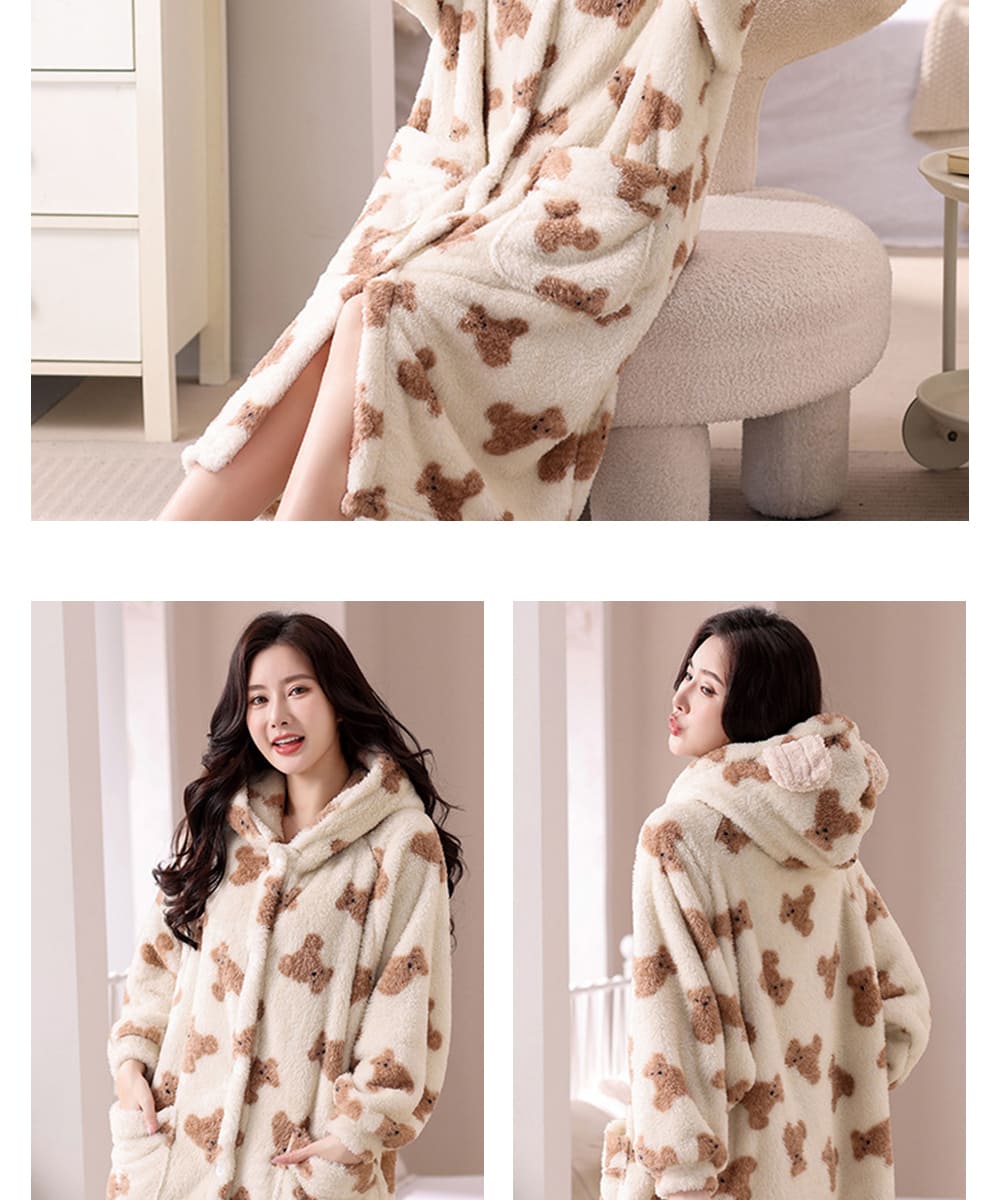 【Kosmiya】1套 法蘭絨保暖可愛小熊睡袍/女睡衣/長袖睡衣/連身洋裝/洋裝/保暖睡衣(均碼/加大碼)