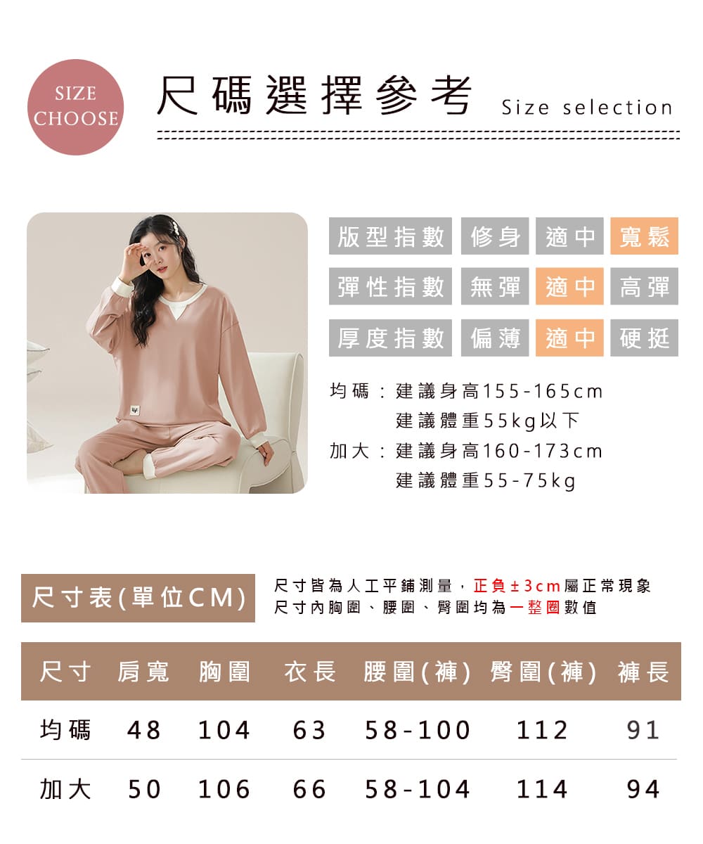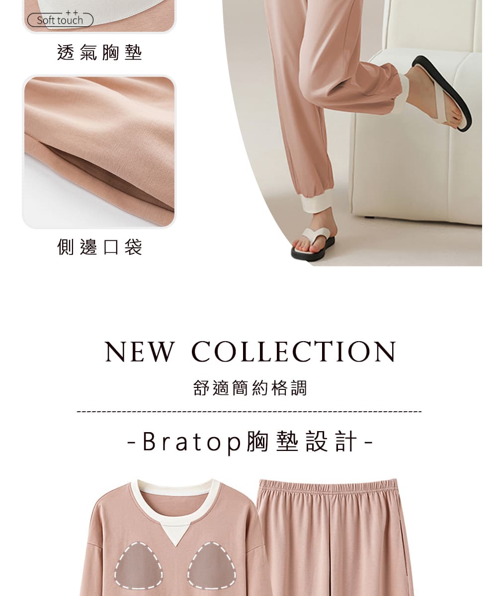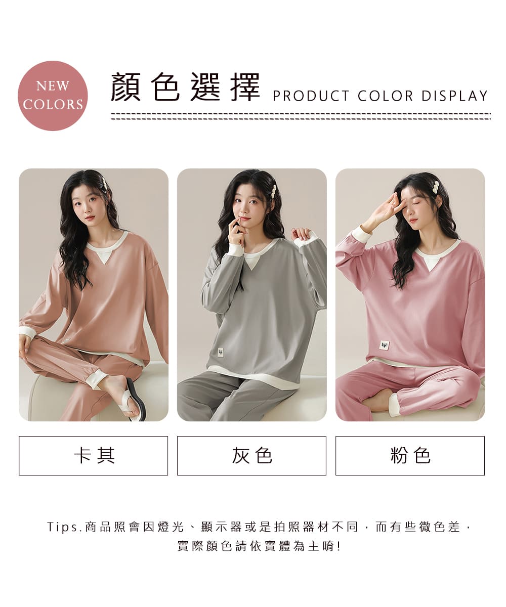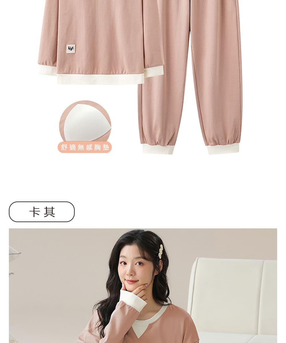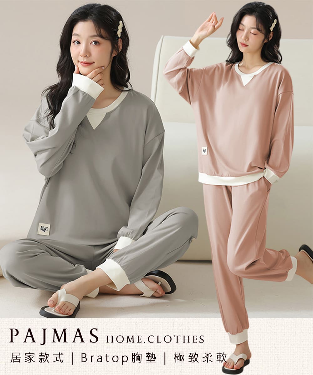 【Kosmiya】1套 帶胸墊 棉質拼接長袖睡衣/女睡衣/居家服/保暖睡衣/睡衣套裝(3色可選/均碼/加大碼)