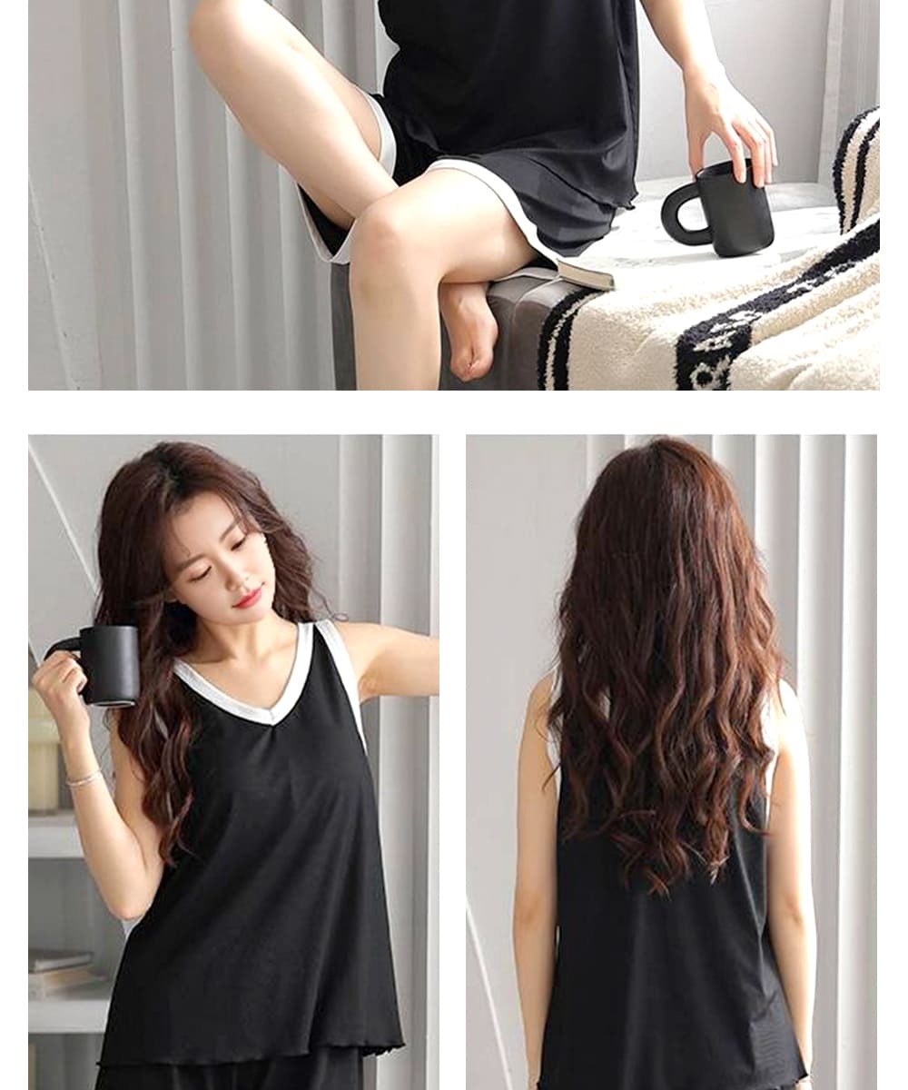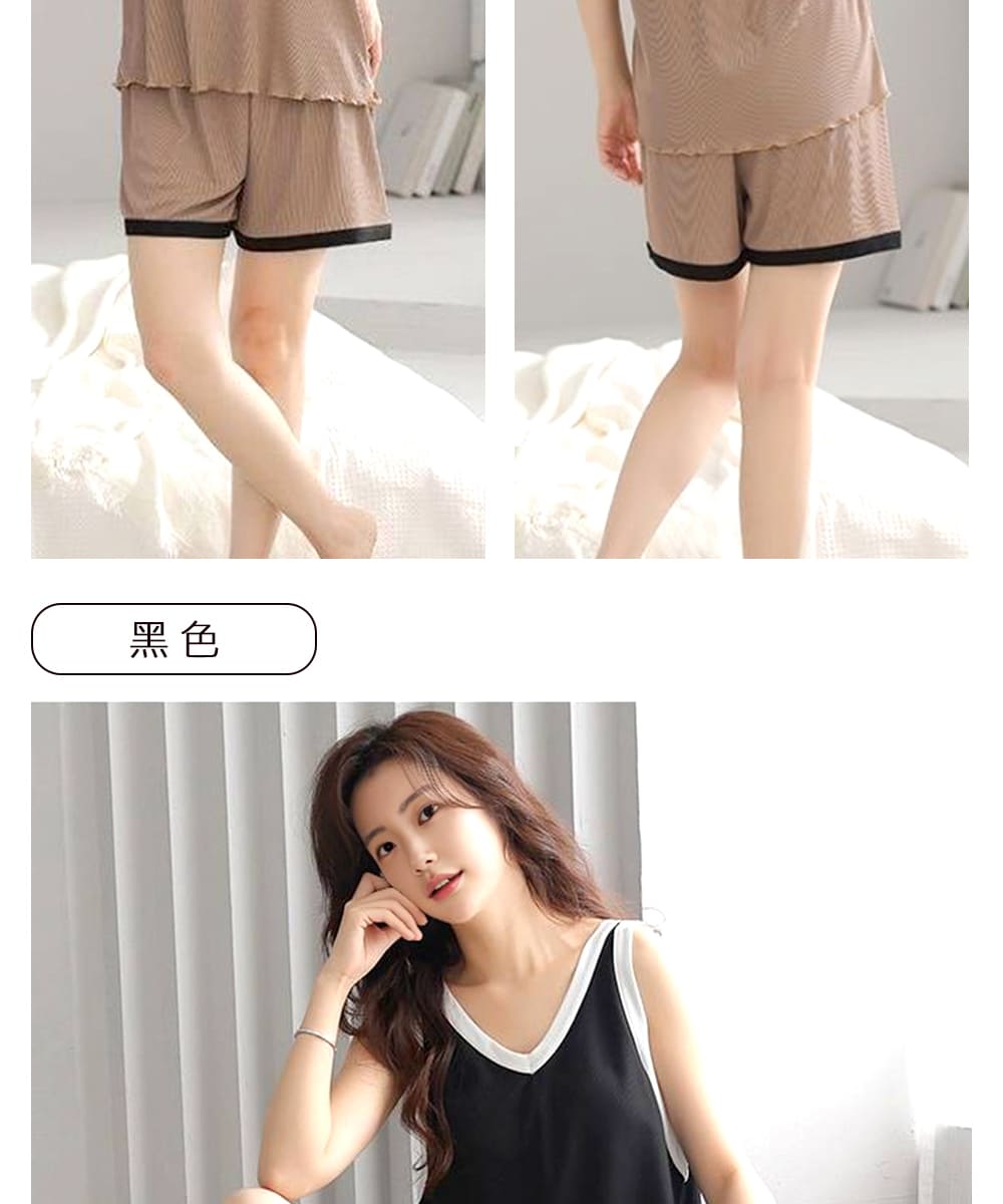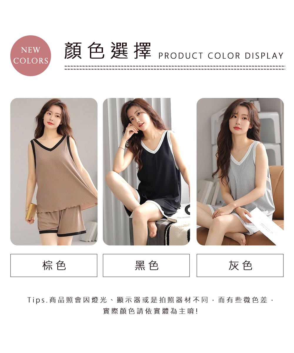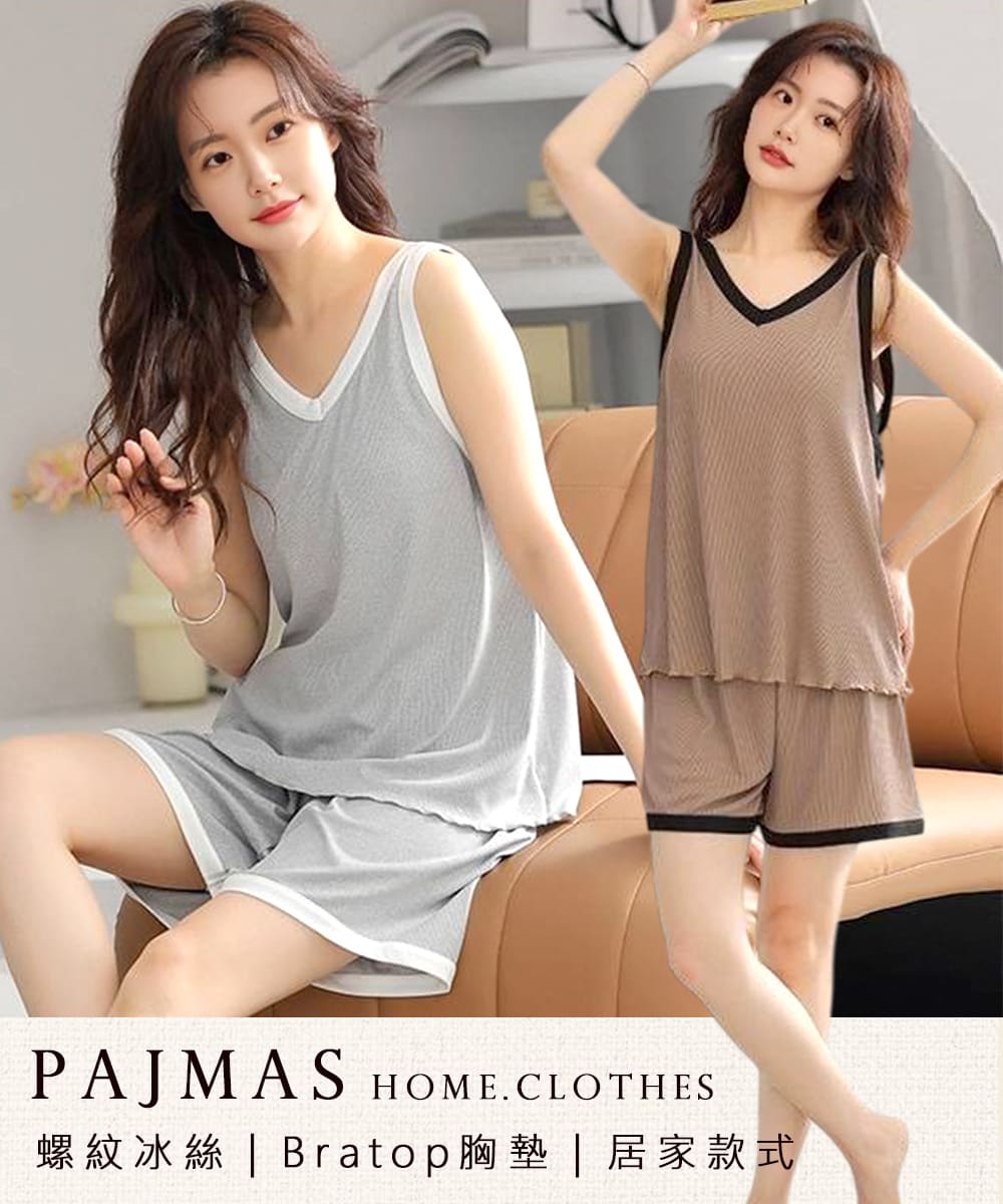 【Kosmiya】1套 帶胸墊 冰絲螺紋 V領撞色無袖睡衣/女睡衣/居家服/涼感睡衣/睡衣套裝(3色可選/均碼/加大碼)