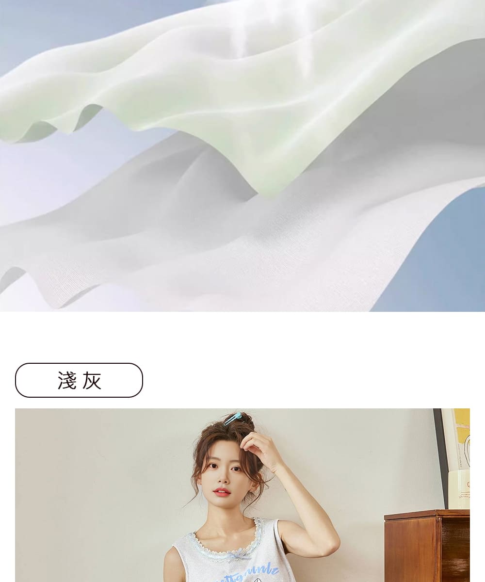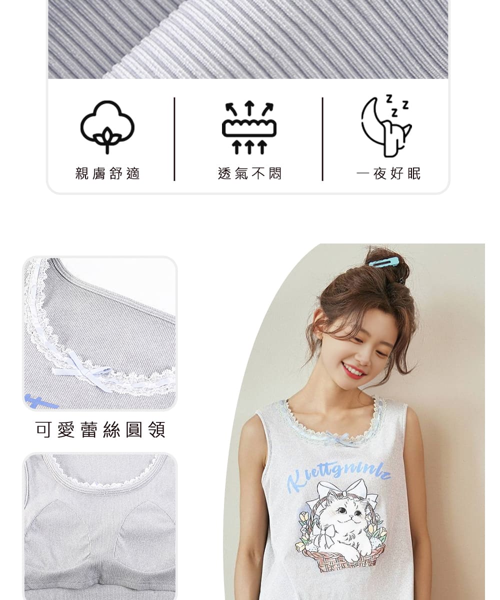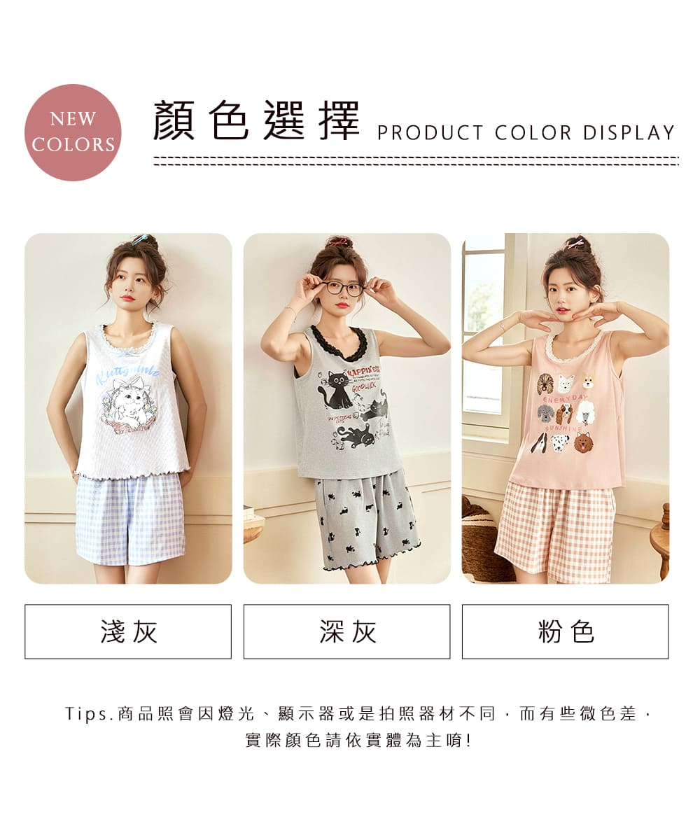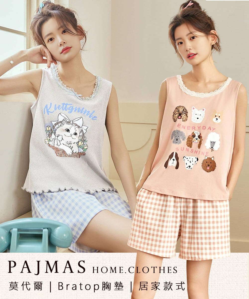 【Kosmiya】1套 帶胸墊 冰絲 甜甜小寵無袖睡衣/女睡衣/居家服/涼感睡衣/睡衣套裝(3色可選/均碼/加大碼)