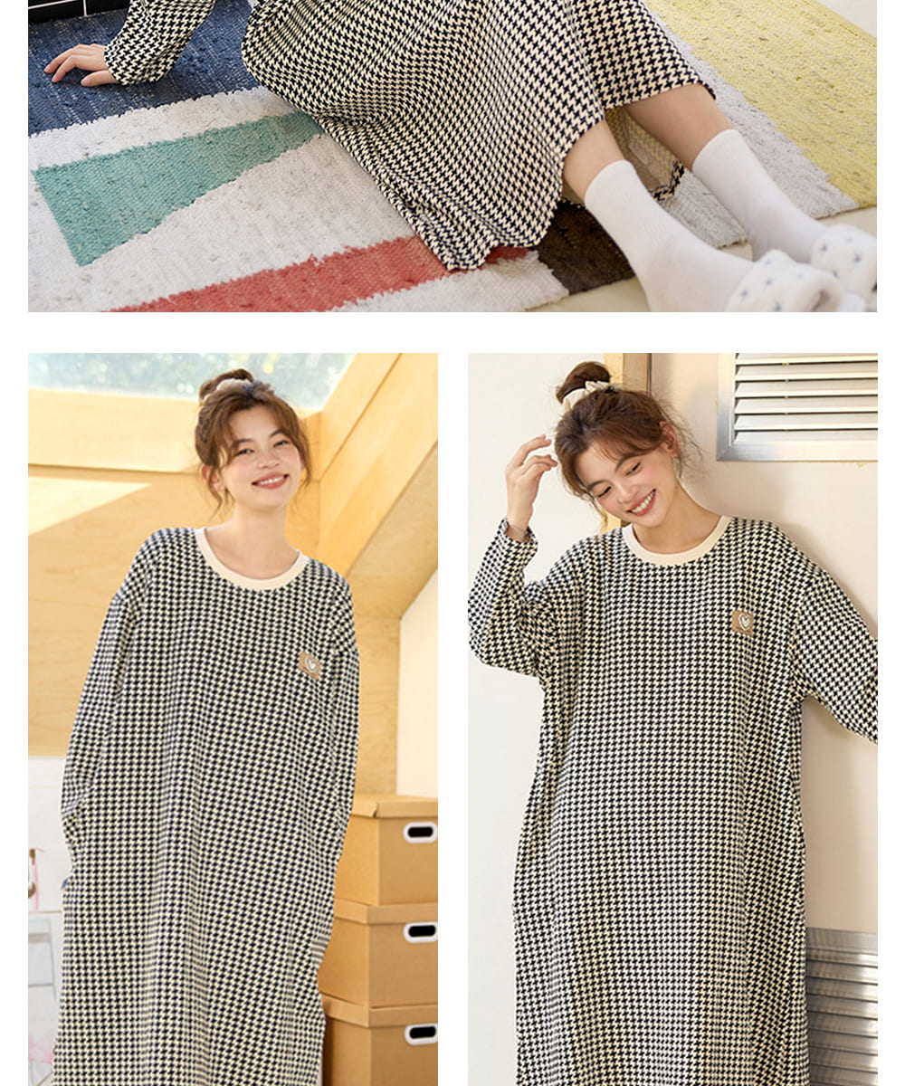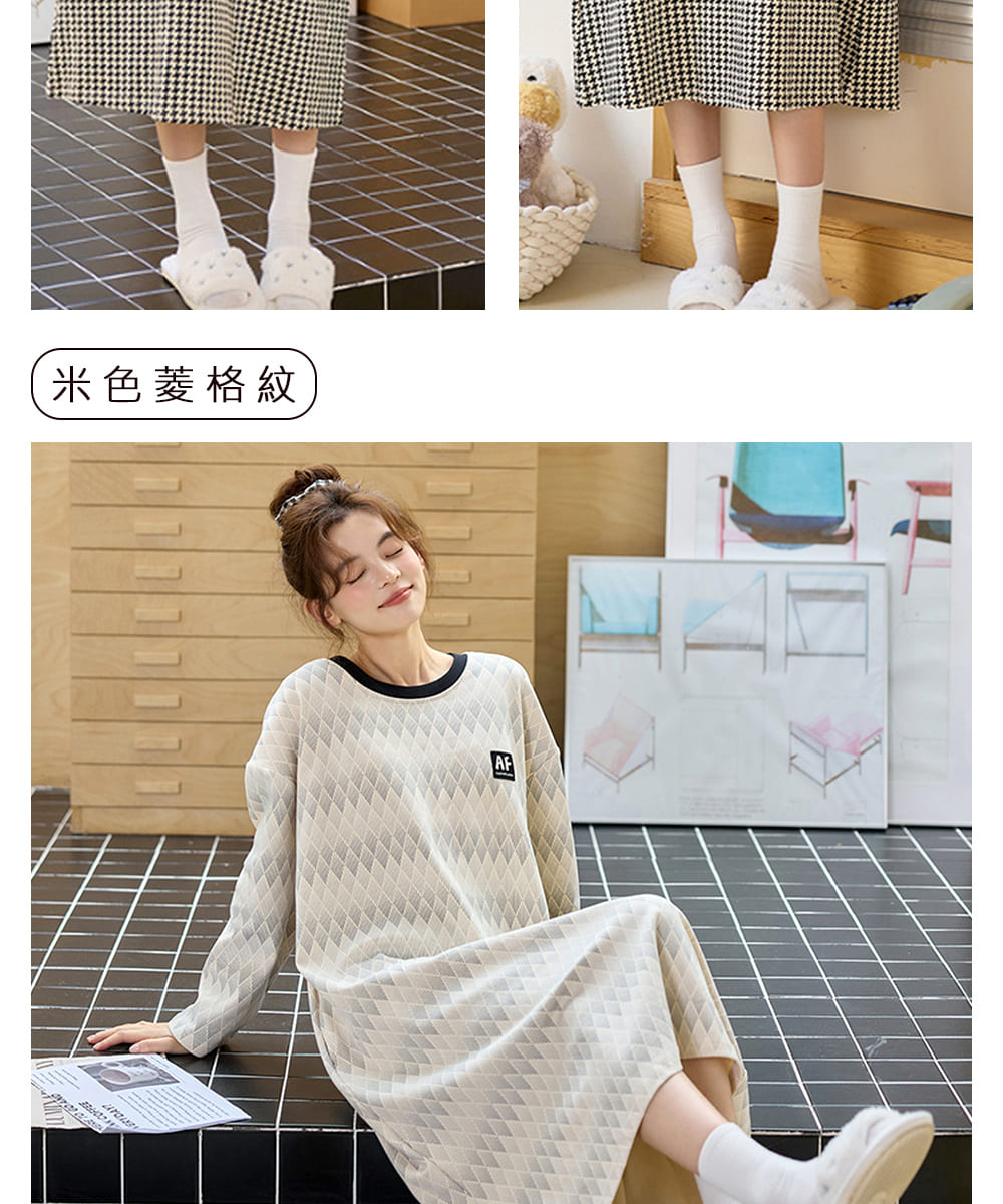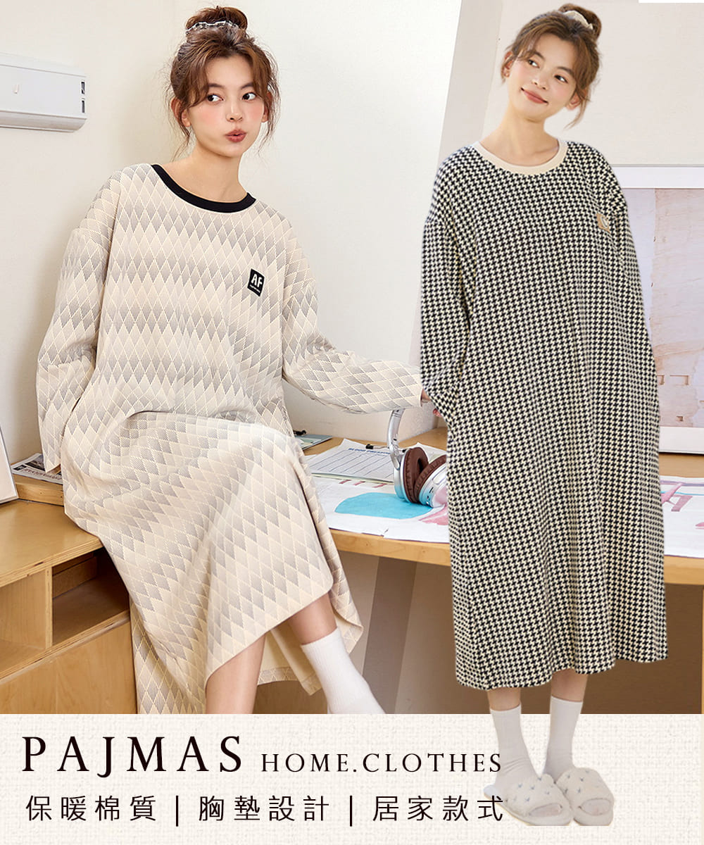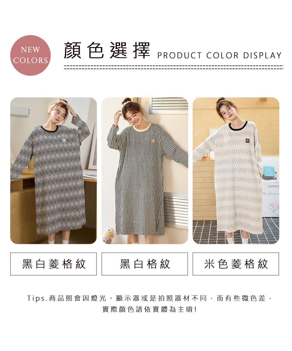 【Kosmiya】 1套 帶胸墊 棉質日系格紋長袖睡裙/女睡衣/保暖睡衣/長袖睡衣/連身洋裝/洋裝(3色/均碼/加大碼)