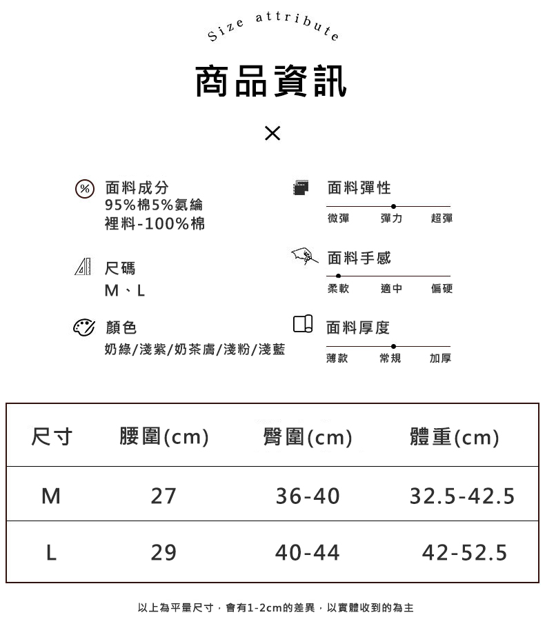 尺碼:M、L 顏色:5色 材質:面料-95%棉、5%氨綸 裡料-100%棉