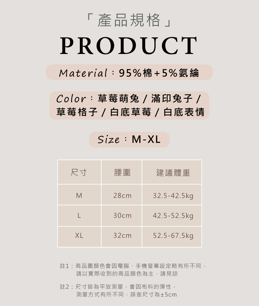 尺碼:M-XL 顏色:5色 材質:面料-95%棉、5%氨綸 裡料-100%棉