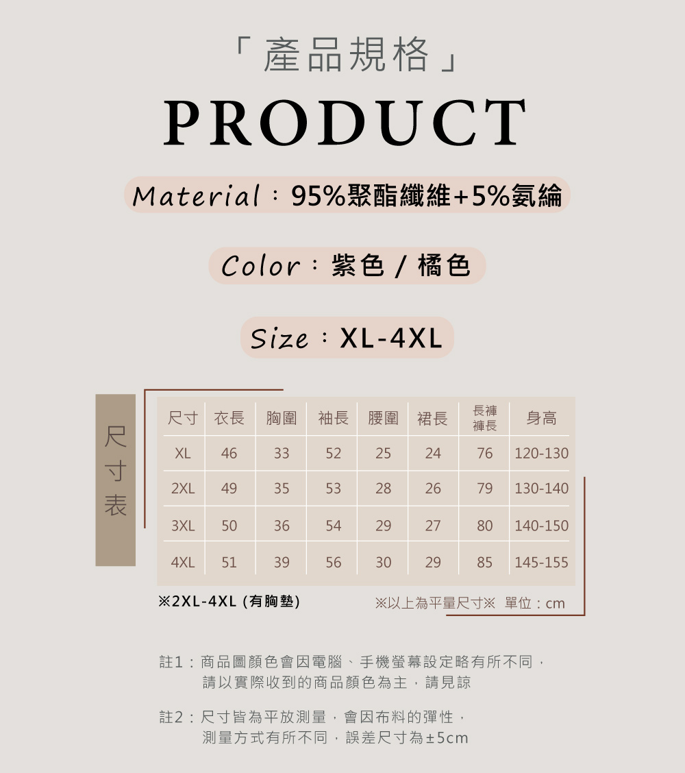 面料:95%聚酯纖維+5%氨綸 尺寸:XL-4XL 款式:紫色/橘色